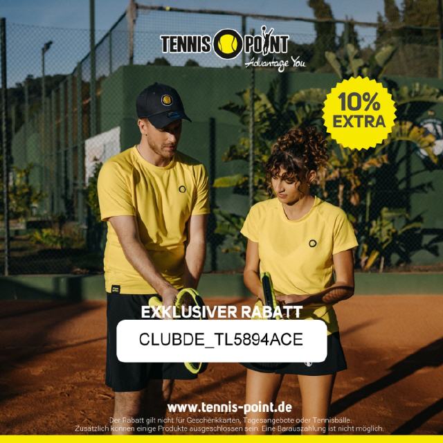 Als Club erhalten wir einen exklusiven Rabattcode, den wir mit allen Mitgliedern teilen können. Dieser Code bringt uns bei Tennispoint 10% Rabatt auf ausgewählte Produkte aus dem Tennis- und Padel-Sortiment.